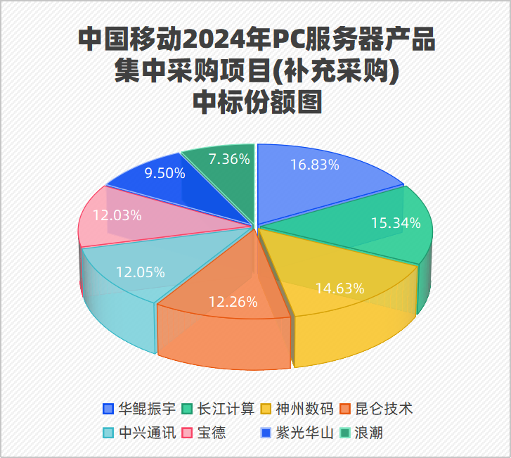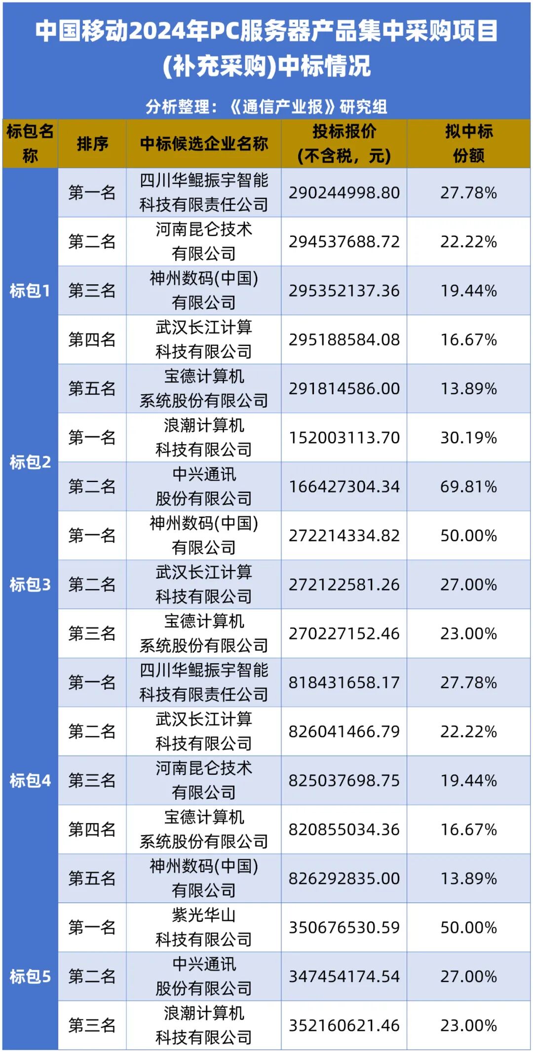 9月29日,中国移动(600941)2024年PC服务器产品集中采购项目(补充采购)开标,华鲲振宇、长江计算、神州数码(000034)、昆仑技术、中兴通讯(000063)、宝德、紫光华山、浪潮等八家公司分享约19亿元大单。