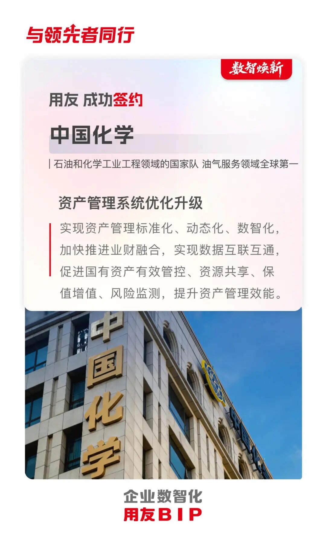 促进国有资产的保值增值是中央企业资产管理数字化转型的核心目标之一,用友深耕企业服务37年,在中央企业数智化转型领域积淀深厚。此次合作将依托用友BIP,进一步推动中国化学资产管理从“流程管控”向“价值运营”升级,为中国化学高质量发展提供坚实支撑,更将为多业态的集团型企业资产数智化管理提供可复制的实践路径!